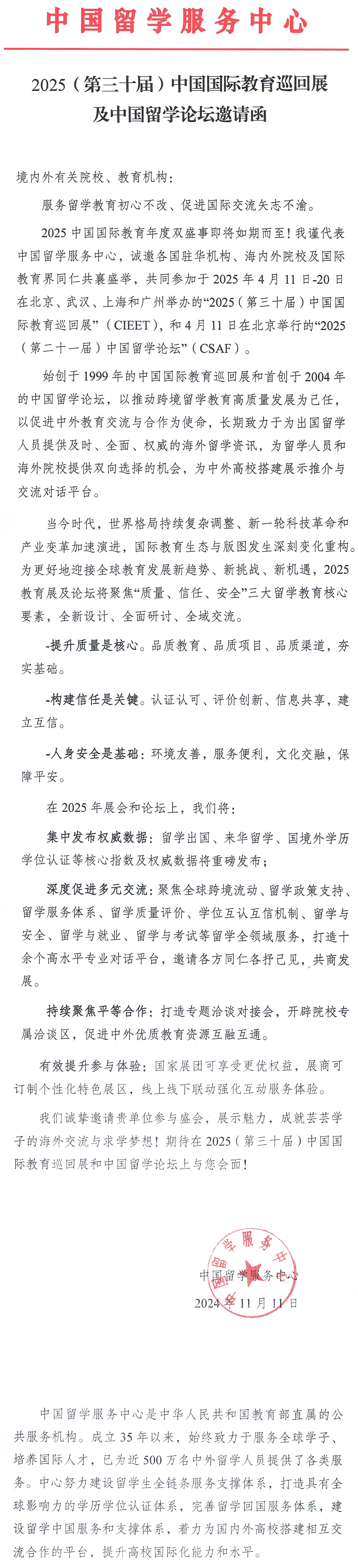 2025年(第三十届)中国国际教育巡回展及中国留学论坛邀请函
